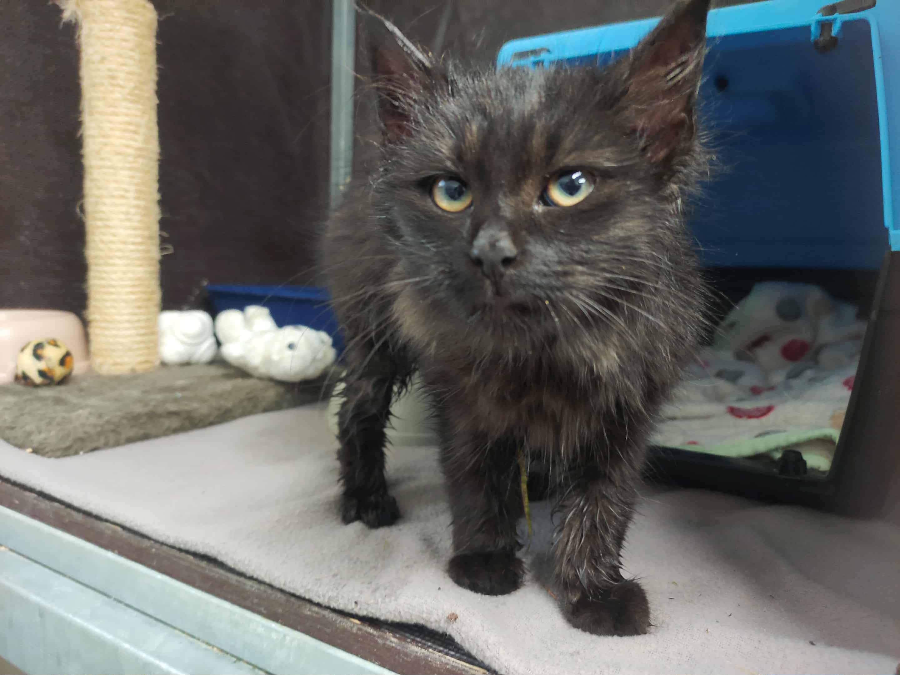 Dne 17. 11. 2025 jsme do péče přijaly z ulice Havanská úplně promočenou kotěcí holčičku, bez značení, s pekelným svrabem v uších. Kočička u popelnic hledala jídlo.